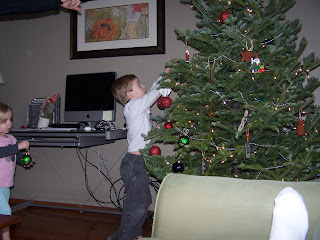 One thing Noah was really excited about was getting out all of the Christmas decorations. So that's how we spent the entire morning. Yes it really did take all morning. Because first I let the kids do it all themselves. Then I made them gather everything up and let mommy help. They rolled with it. (Really though, would you want a stuffed snowman sitting on top of your trash can? Or tree ornaments hung from the nobs of each and every (bottom) kitchen cabinet? Or stockings hanging from light switches? Or how about a box of Christmas cards propped up on your coffee table?)